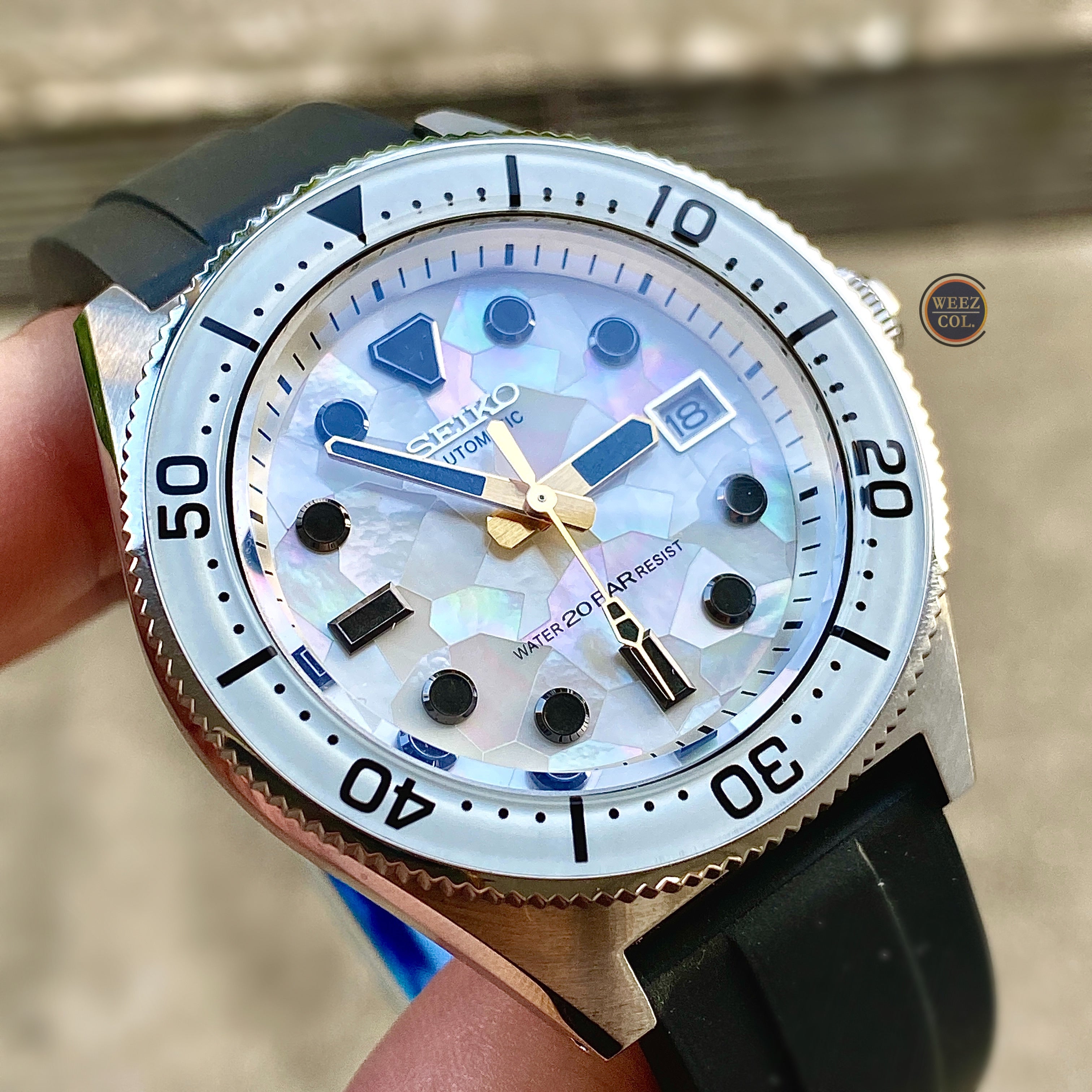 Dial: Aftermarket Seiko Mother-Of-Pearl Dial (Black Lume)
