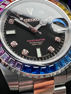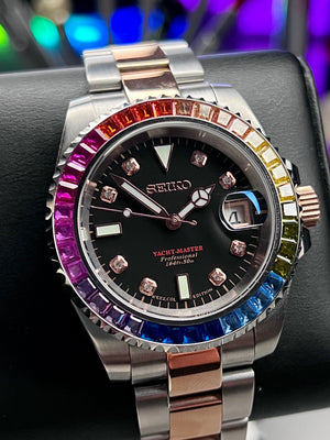 Dial: Aftermarket Seiko Custom Yachtmaster Dial w/ Faux Rainbow Diamonds (BGW9 Lume)